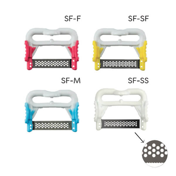 - A Referencia SF-S, dentado tipo serra é usada para separação de espaços interdentários. Após a separação do ponto de contato, utilizando esta tira de acabamento, pode-se continuar o acabamento usando as tiras diamantadas como acima indicado. Através deste procedimento, evitase o ferimento da papila.