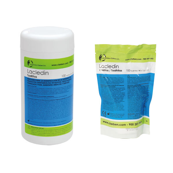 Toalhitas Desinfetantes LACLEDIN | Clarben, com um novo sistema de vedação que os mantém mais molhados durante mais tempo, o qual facilita seu uso tanto nas mãos como na superfície da clinica.